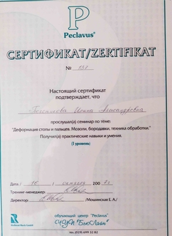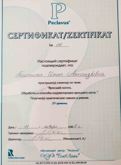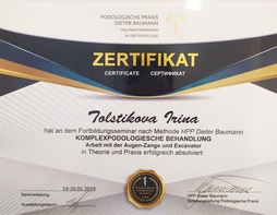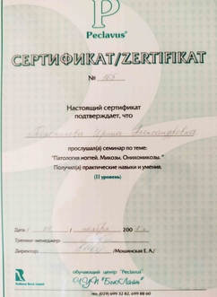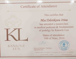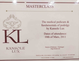 Подология-это наука об уходе за здоровой и проблемной стопой. В 2007 году я начала свои первые шаги в подологии, став мастером педикюра по аппаратной технологии, пройдя индивидуальное обучение у Е.Мошинской в филиале лучшей, на мой взгляд, школе педикюра "Нэт Лайн 21 Век". Ее особенностью является то,что технологии и методики разработаны самой авторитетной немецкой подологической школой Hellmut Ruck GmbH. Я научилась работать не только аппаратом, но и уникальным инструментом, позволяющим мне вручную обрабатывать самые глубокие и труднодоступные места. Скальпельной техникой обработки стопы я владею с 2010 года.